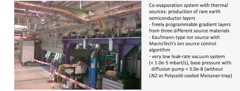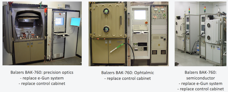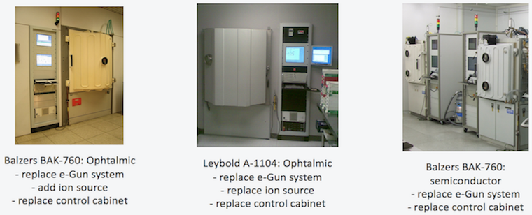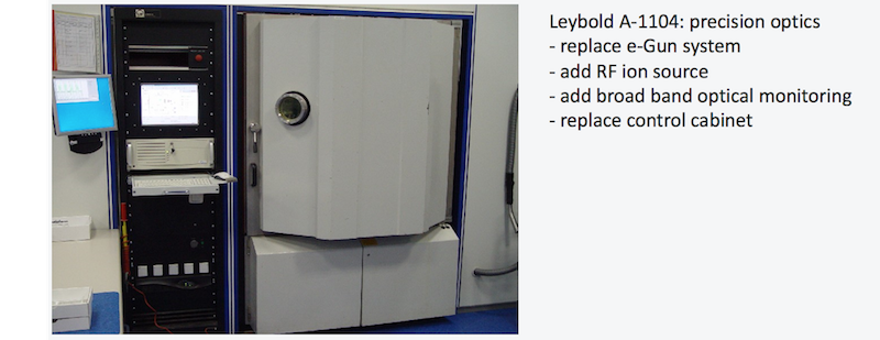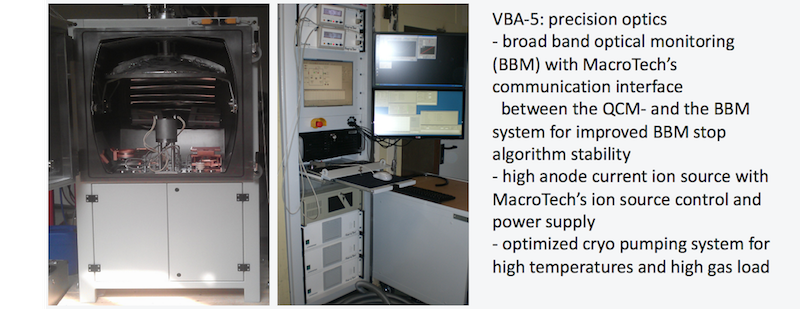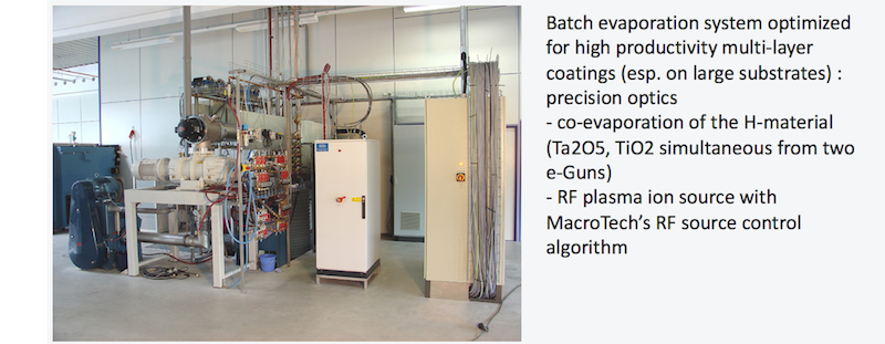 Design is based on specific know-how from the customer and MacroTech. Support will be provided by MacroTech for the design (i.e. drawings). Machines are also optimized for special requirements of the customer. Implementation of the customer specific design can be equally found in the control software. Design and control software provide very high throughput, very tight process limits. Open machine layout, prepared (e.g. in the control and power cabinet) for later upgrades (e.g. with RF plasma source, optical monitoring system, additional evaporation sources etc.). Integration/support for the process components from all major e-Gun-, ion source-, optical monitoring systems etc. (see above) Guaranteed process and throughput specifications, demonstrated during the pre-acceptance test (at MacroTech's production facility) as well as during the final-acceptance test (at customers site)